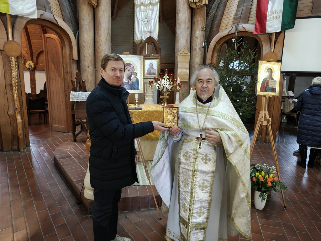 Староста Покровского прихода Владимир во время богослужений читает Апостол, и в этот праздничный день он получил благословение протоиерея Николая на ношение стихаря, также он перед Литургией передал настоятелю богослужебное Евангелие, дар приходу от его семьи и семьи Маклари.