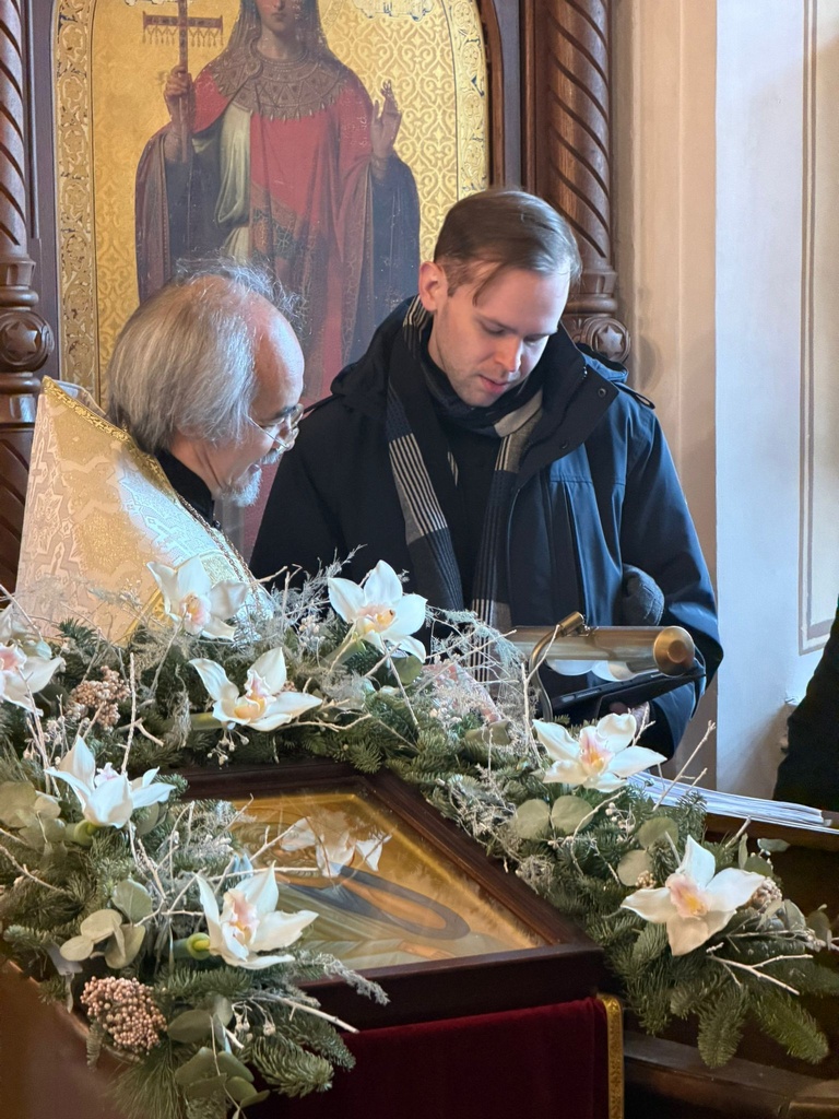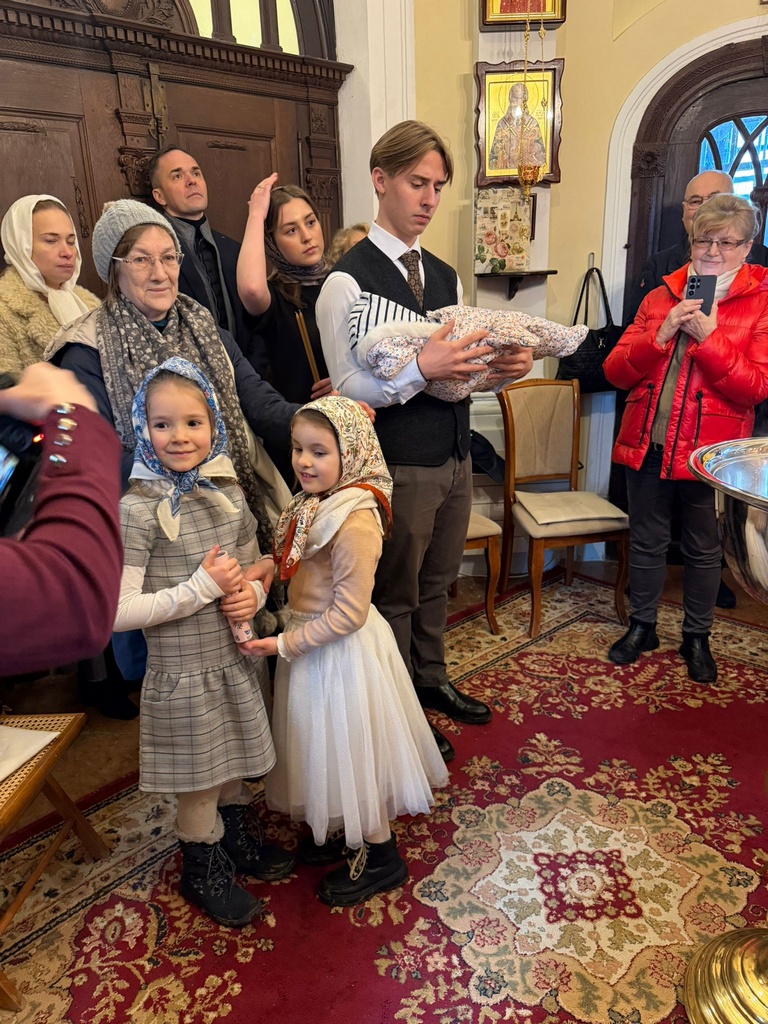 У крещальной купели собрались родственники и прихожане, присутствовал священник, служащий в Иреме, иерей Димитрий Свирко, пел хор под управлением Георгия Суркова из Будапешта.