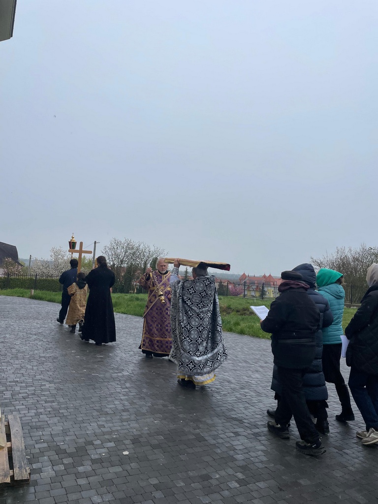 На улице в течение всего дня шел дождь, под погребальные колокольные звоны (звонарь Георгий Томищ) настоятель, диаконы и прихожане медленно обошли вокруг храма,.
