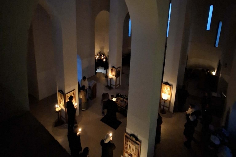 Начались богослужения затемно, из освещения в храме были только свечи. В начале богослужения в центре храма на амвоне Плащаница – плат с изображением Христа, лежащего во гробе. Чин Выноса и Погребения Плащаницы были совершены согласно Уставу в Великую пятницу.